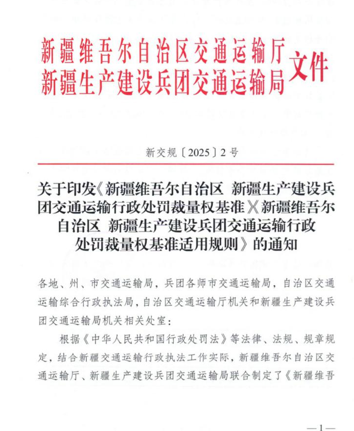 附件:1.新疆维吾尔自治区 新疆生产建设兵团交通运输行政处罚裁量权基准