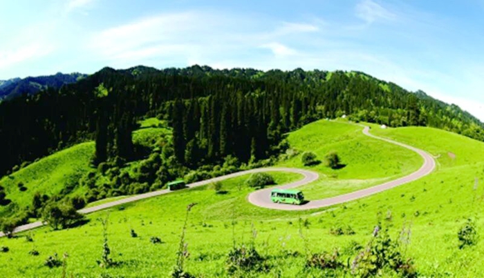 在新源县那拉提草原,旅游公路串联雪山草甸,是交通动脉,亦是风景长廊(2024年7月2日摄)。