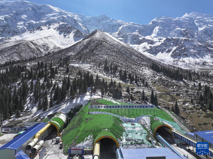这是10月5日在新疆昭苏县拍摄的昭温公路西天山特长隧道进口端(无人机照片)。从左至右依次为平导洞、左洞、右洞。新华社记者 胡虎虎 摄