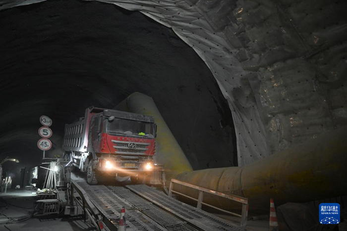 施工车辆行驶在昭温公路西天山特长隧道右洞内(10月5日摄)。新华社记者 胡虎虎 摄