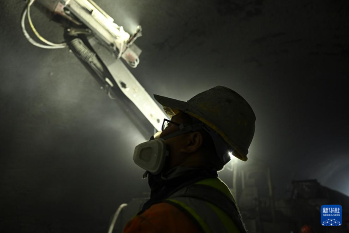 来自甘肃的工人王更兴在昭温公路西天山特长隧道左洞内施工(10月5日摄)。新华社记者 胡虎虎 摄