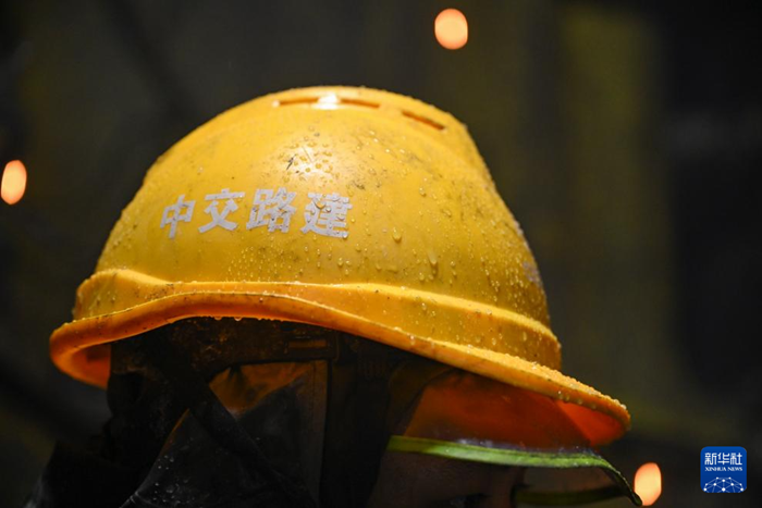 隧道内的渗水淋到工人的安全帽上(10月5日摄)。新华社记者 胡虎虎 摄