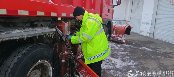 阿严·先生哈利一边用戴着薄手套的手擦拭车窗上的霜,一边和同事交流着天气情况和可能出现的路况。“这几天玛依塔斯风区将出现大风,伴随降雪,加上昼夜气温变化幅度大,部分路段有可能会结冰,就得上路除雪清冰。”他说。