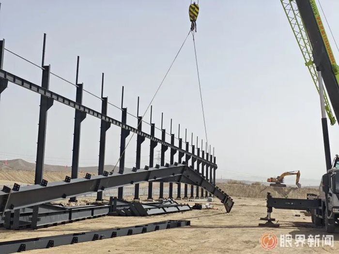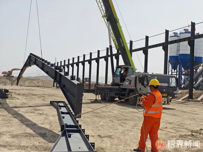 G3033线奎屯至独山子至库车高速公路项目土建施工6标正在进行智能钢构加工配送中心建设。图为吊车吊起一榀钢梁。记者史传芝摄