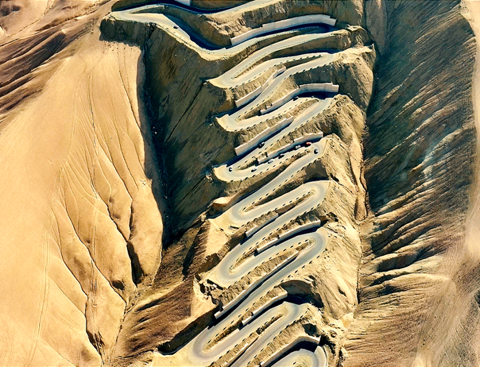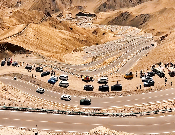 面对海拔三千米以上的峻岭深壑,依循“依山就势、梯度降坡”的巧思,以639道迂回曲线破解天堑之困。沥青路面缀连防撞护栏与反光标识,观景台与木栈道隐现山间,终使巨龙跃出帕米尔,成就“车在云中行,景随轮轴转”的奇观。