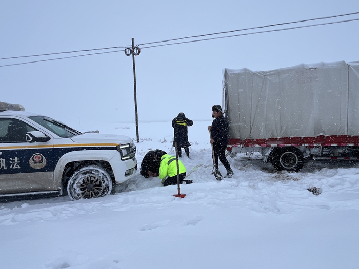 由于现场积雪较厚、路况复杂,执法人员利用随车携带的铁锹、拖车绳等工具,经过半个多小时的努力,成功将被困车辆拖出积雪区域。救援结束后,执法人员还向受困群众送上泡面、开水等应急物资,帮助其恢复体力,缓解紧张情绪。