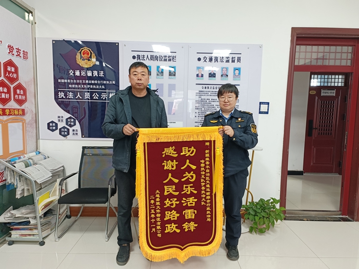 近日,大连盛驰大件物流有限公司负责人专程到访哈密执法支队伊吾执法大队,将一面印着“助人为乐活雷锋 感谢人民好路政”的鲜红锦旗郑重交到执法人员手中,言语恳切地再三致谢。这面沉甸甸的锦旗,既是企业对交通执法工作的高度认可,更是大队践行初心使命、认真履职尽责的生动写照。