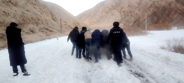 险情就是命令,责任重于泰山。执法人员立即停车,迅速开启警示灯,在现场设置警示标识,提醒过往车辆减速避让、有序排队,防止二次事故发生。针对被困车辆,执法人员不顾路面湿滑寒冷,徒手协助驾驶员清理车轮周边积冰,合力推车脱困。同时,耐心安抚被困驾驶员情绪,告知其路面结冰注意事项,引导车辆缓慢通行。
