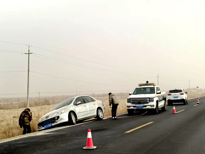 发现险情后,执法人员秉持“安全优先、科学处置”原则立即靠边停车,迅速启动道路突发事件应急处置流程。在事故现场来车方向100米处摆放反光锥、开启执法车辆警示灯,划定安全防护区域,同时对过往车辆进行有序疏导,引导车辆减速慢行、避让事故现场,耐心向驾驶员说明情况,避免交通拥堵及追尾事故发生。前往路基处查看驾乘人员状况,安抚其情绪,确认无大碍后,详细询问事故发生原因,结合现场地形,制定简易拖曳方案,精准配合完成车辆拖曳作业,将受损轿车转移至路面安全区域。