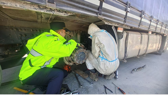 当日上午,卡拉苏口岸国际道路运输管理局执法人员在通关区域例行执勤查验时,发现一辆塔吉克斯坦籍货运车辆滞留现场无法正常行驶,驾驶员异常焦急。执勤人员当即上前,结合常年服务跨境驾驶员的工作经验耐心问询,得知驾驶员驾驶车辆驶入口岸拐弯时突发故障,加之对口岸局部环境不熟悉,又受高原恶劣条件影响,导致一时难以脱困。执法人员迅速安抚其情绪,随即分工协作:一组引导车辆停靠安全区域并设置警示标识,保障口岸通行秩序;另一组从“司机之家”取出应急维修工具借给马利克扎堤,全程配合开展维修作业,经共同努力,车辆顺利修复启动。