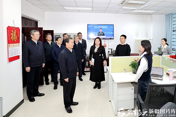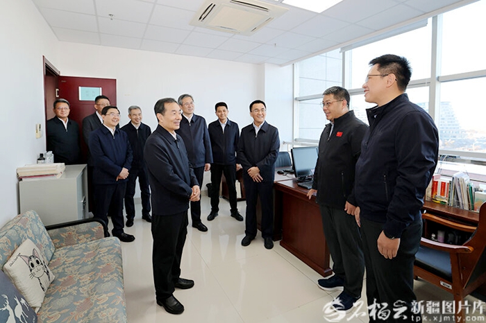 11月7日,自治区党委书记、兵团党委第一书记、第一政委陈小江在新华社新疆分社,了解新闻信息产品,看望慰问一线采编人员。石榴云/新疆日报记者 崔志坚摄
