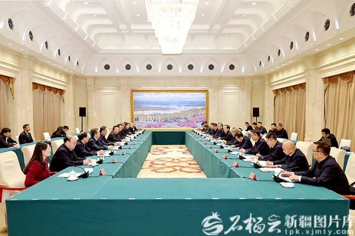 11月20日,自治区党委书记陈小江、自治区主席艾尔肯·吐尼亚孜在乌鲁木齐会见水利部党组书记、部长李国英一行。石榴云/新疆日报记者 崔志坚摄