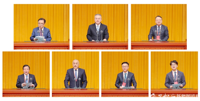 11月18日,在2025新商大会上,中国工程院院士彭苏萍、中国华电集团总经理叶向东、浙江恒逸集团总裁倪德锋、特变电工董事长张新、阿联酋中国新疆商会暨同乡会会长阿不来提·买买提、上海新疆商会会长韩宇泽发言。新商联盟主席杨剑发布联盟倡议(由上至下、由左到右)。石榴云/新疆日报记者 崔志坚摄