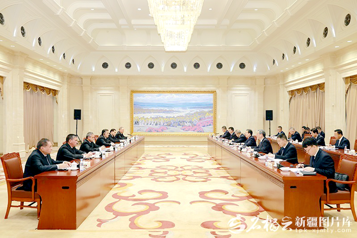 1月14日,自治区党委书记陈小江、自治区主席艾尔肯·吐尼亚孜在乌鲁木齐会见土库曼斯坦副总理阿塔哈雷耶夫。石榴云/新疆日报记者 崔志坚摄